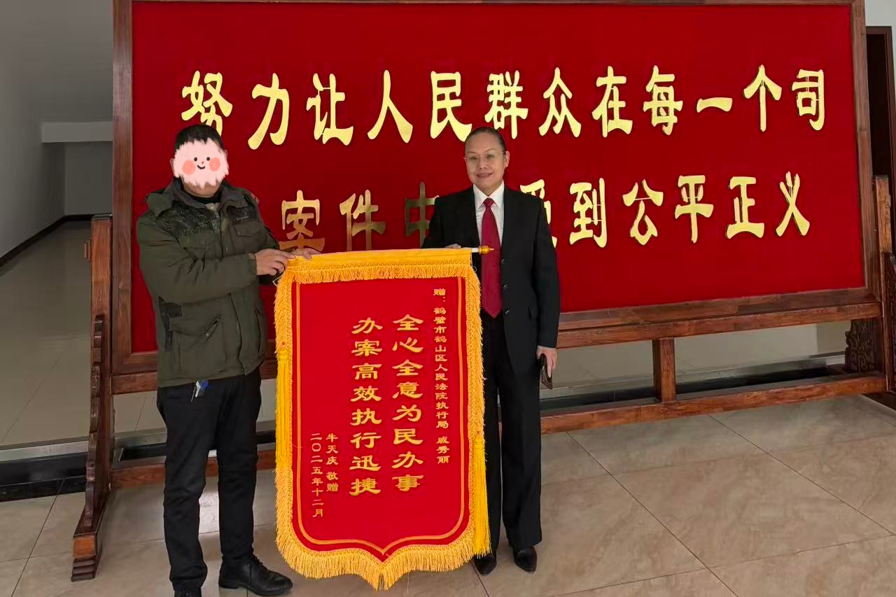 近日,鹤山区人民法院成功执结一起工伤赔偿纠纷案,切实维护了当事人的合法权益。申请执行人胡某家属专程来到法院,将印有“全心全意为民办事 办案高效执行迅捷”的锦旗送到执行法官戚秀丽手中,对法院高效推进执行、及时为当事人兑现胜诉权益表示由衷感谢。